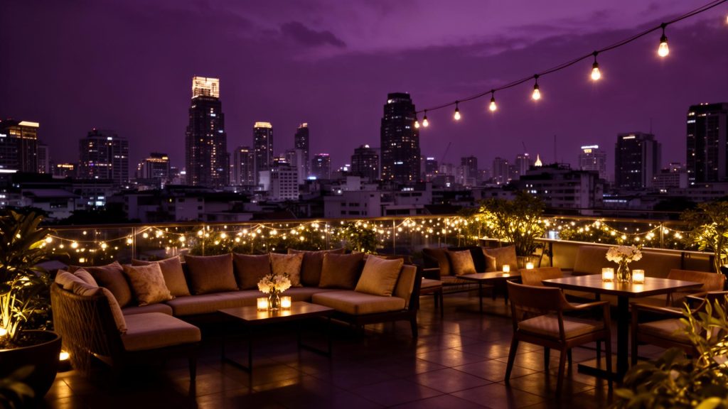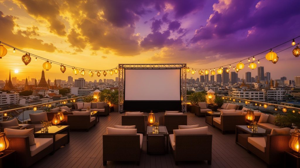 Perched above the Bangkok skyline, our rooftop venue transforms into an intimate outdoor cinema as the sun sets. With the city lights as our backdrop and the stars above, every screening becomes an unforgettable experience.